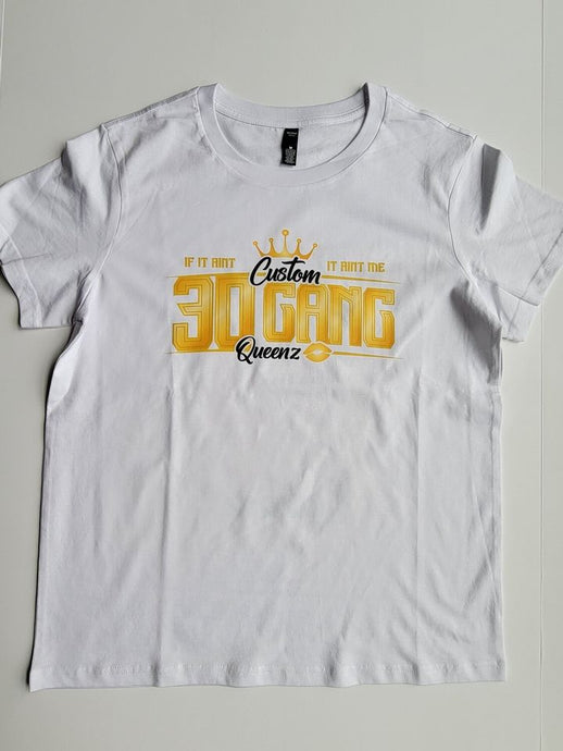 30 Gang Custom Kingz Apparel - Women's 30 GANG Block Tee -White Yellow and Black $35.00