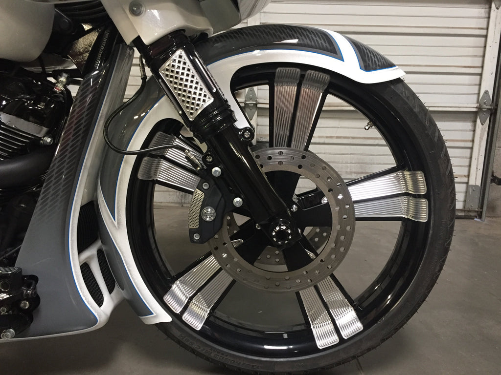 Check out our thick sick Harley wrap metal front fender for your Street Glide, Road Glide, Road King, Electra Glide touring model and even Softail. Only the best 14 gauge steel hand spun designed to hug the tire and flow with the rim to give you that slick design. We have conveniently pre drilled holes for mounting so it takes the guessing work out of the equation, simple and clean. Level 1 installation difficulty. See description below for more details.