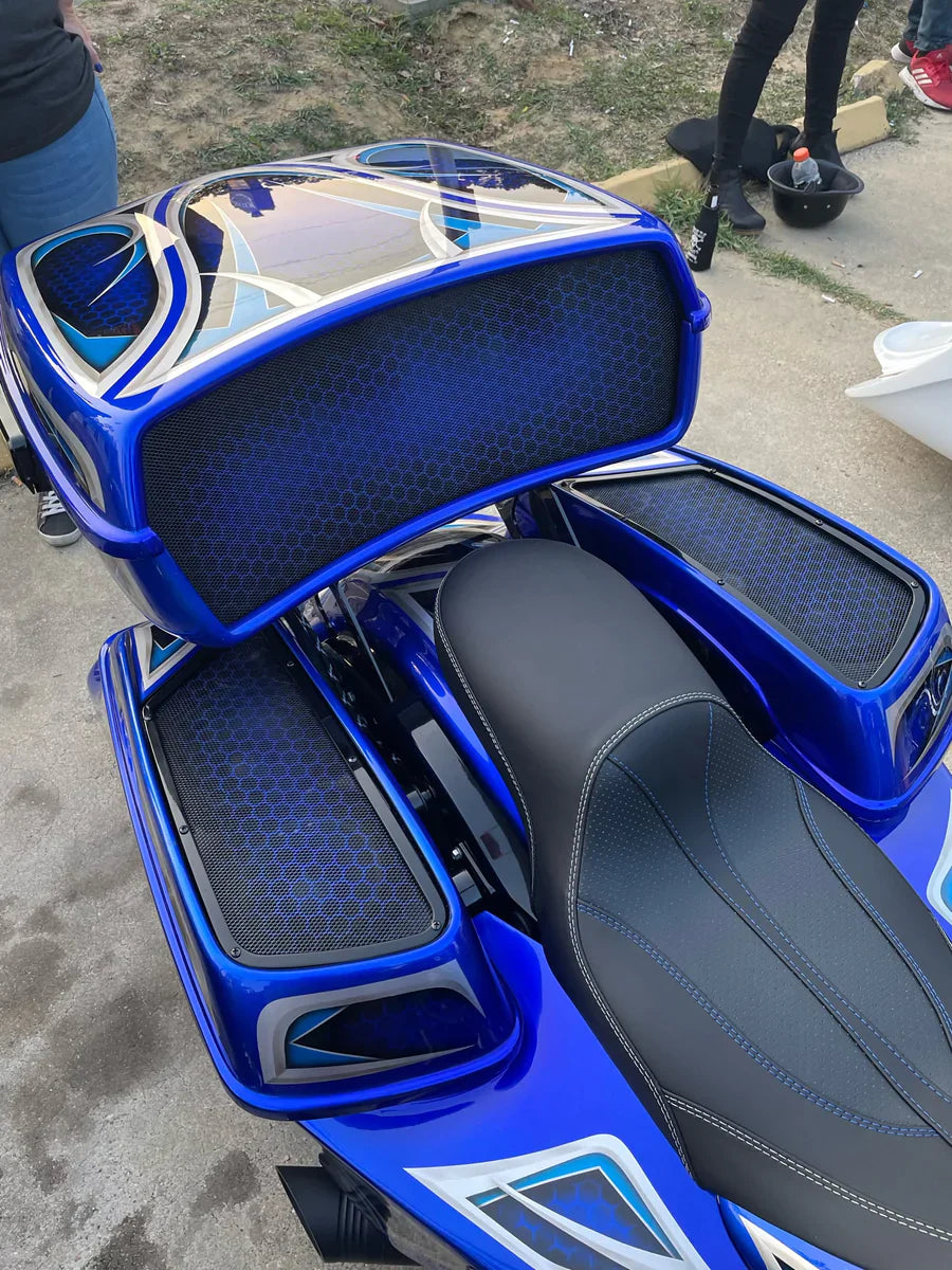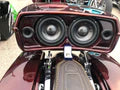 Dual 8" Ported Tour Pack. This tour pack gives you added storage and that full sound you are looking for without cutting into your bags. It will come with the base, lid, grill, chrome or black hardware and sealed enclosure for the dual 8" . We can also do full packages with 8", horns and amps.