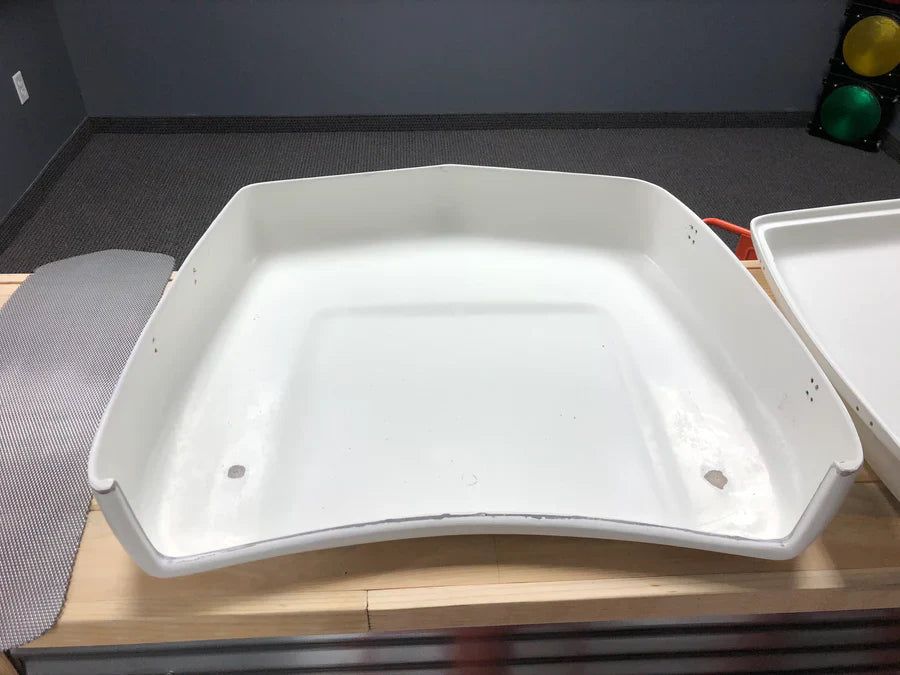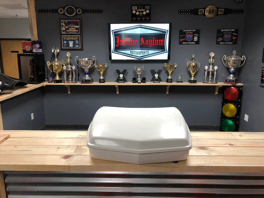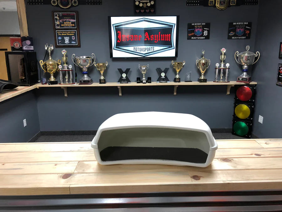 Our same slimline tour pack gutted. You do what you want! We provide the frame work you finish it off. These will come with base, lid, grills, chrome or black hardware, and a blank front face.