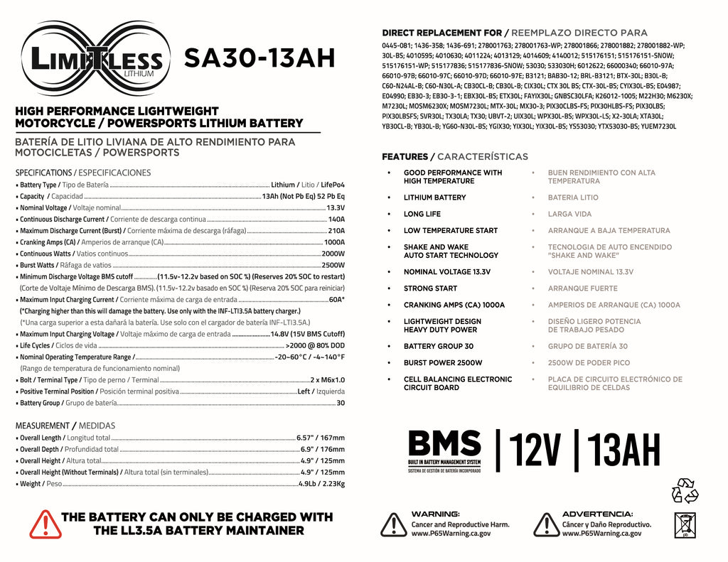 LIMITLESS LITHIUM - BATTERIES - Shake Awake 30 Case 13Ah Smart Motorcycle battery (Under the seat replacement)