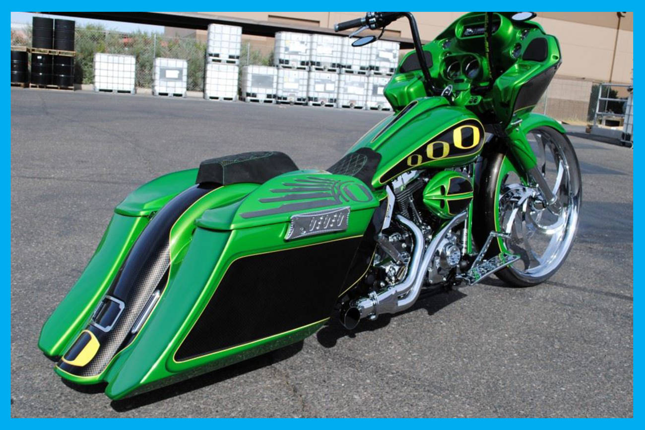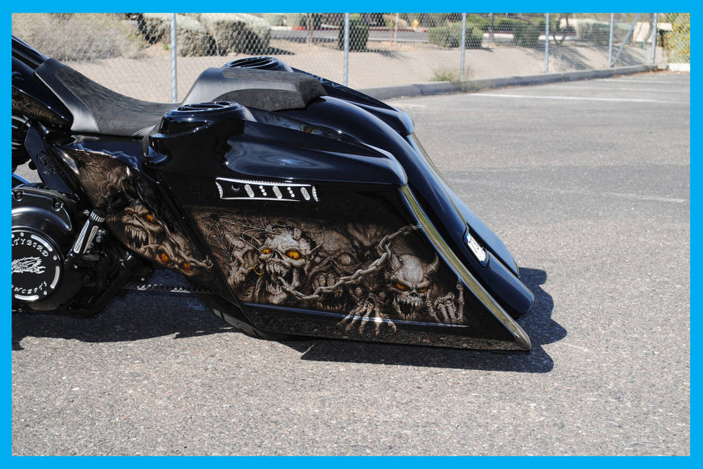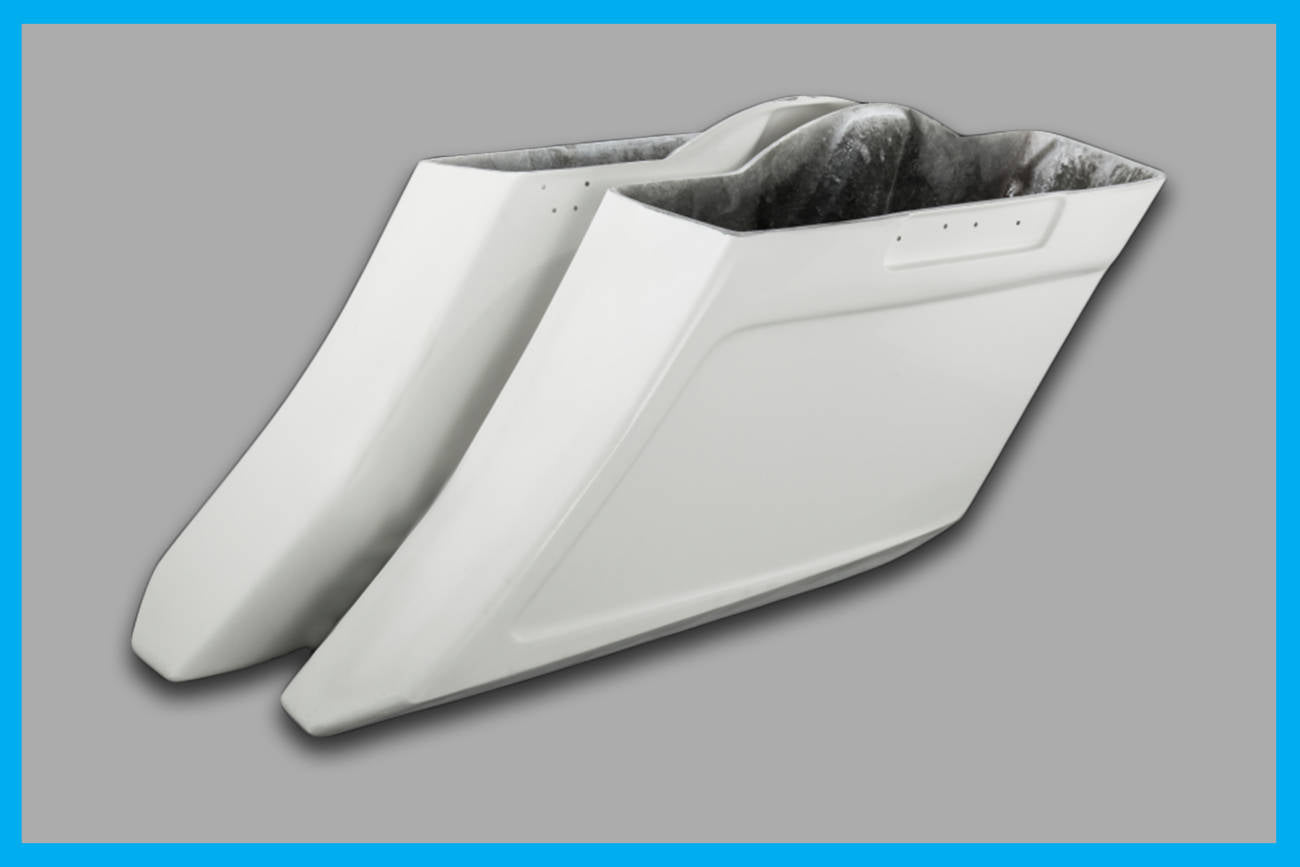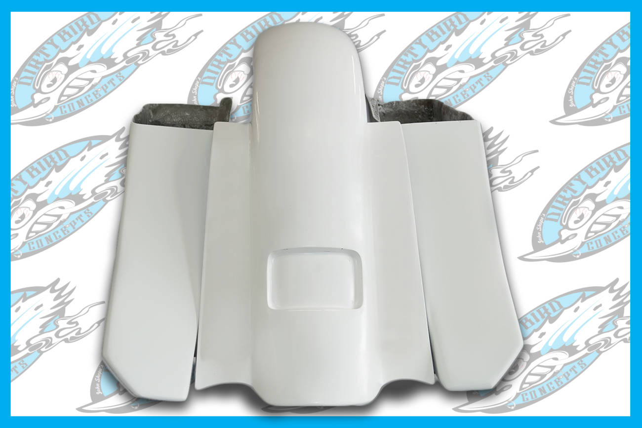 John Shope’s first again wicked Harley Davidson bagger design is a hit. The Top Shelf Ass End saddlebags and rear fender were inspired by the one and only “Twisted Bike” we created. We give you these 8″ down 10″ back saddlebags with matching rear fender. Made out of high quality hand laid fiberglass, the quality and our workmanship speaks for itself. You get a set of Harley Davidson bagger saddlebags and a replacement rear fender combo. All your stock factory hardware, lids and seat will transfer over to this bad boy but who wants stock anyways, your building a custom bike so be sure to pick up DBC paint savers, side filler panels , and DBC lids to complete the look. For dual cut-outs, the tips need to point down. You can get 90 degree tips or bend a piece of U pipe, it is super simple to do. We recommend that you also purchase our 3-D fender strut covers to achieve the overall look as seen in our builds. Level 2 Installation. See below for more details.