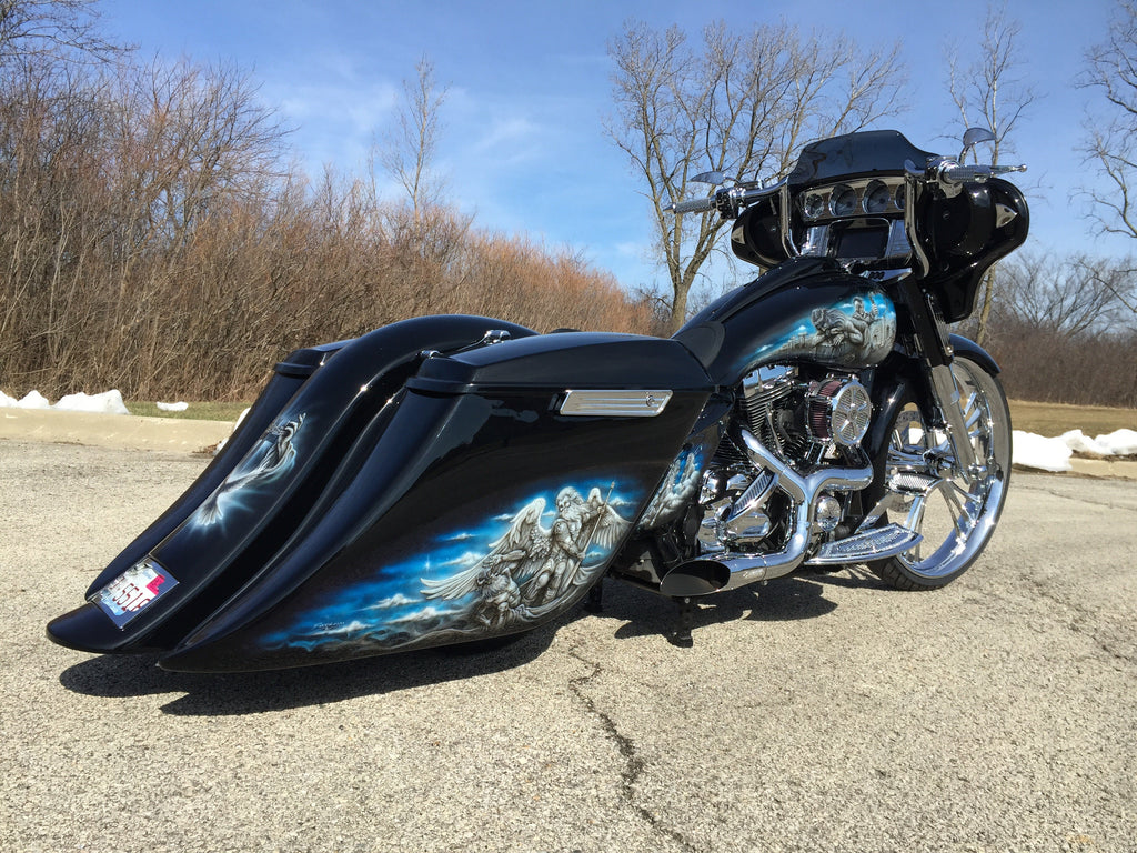 7.5″ Stretch, 14″ Sweep kit includes the Bags, Fender, Side Cover, Plate Frame All Bags come primed and carpeted All parts are vacuum infused with a high end resin, oven cured at high temp These bags are made to ride, the floor boards hit the ground before the bags do All parts will need to be sanded smooth before painting, no other prep before painting This kit is recommended for bike that have air ride and also 30-36 inch tire on the front Please allow 2-3 weeks when your order is placed, all of our products are made by hand.
