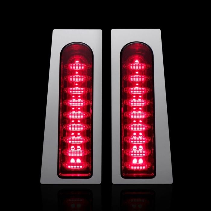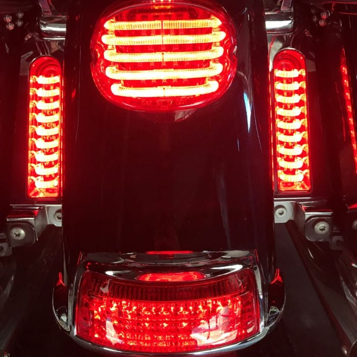 Designed to fill in the stock oval cutout on the newer style saddlebag support rails on 2014-2020 Harley-Davidson® Road King, Electra Glide, Ultra and Road Glide and CVO™ Models IFPainted Filler Panels are Removed. They have 33 super bright automotive grade LEDs per unit, a choice of Red or Smoked lens and a choice of Chrome or Gloss Black base. Units can be installed with included plug and play adapter to function as Run-Brake-Turn or Brake-Turn. Lifetime Warranty Against LED Failure.