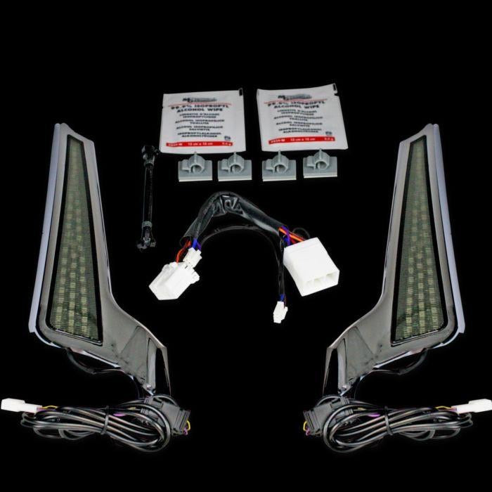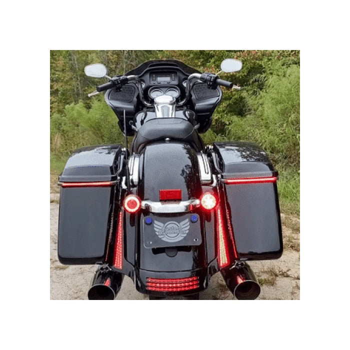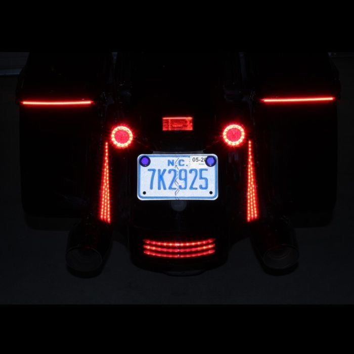 The perfect solution to add stylish visibility to the back of your Street Glide or Road Glide. 45 super bright dual intensity red LEDs on each side illuminate to function as additional Running & Brake lights. Completely sealed behind a red or smoked lens with a decorative chrome or gloss black trim. Units adhere to each side of the rear fender fascia with double sided tape and include a plug and play wire harness for a simple install. The design of the Fascia LED Panels compliments the ProBEAM® LED TriBar 1 perfectly! Custom Dynamics® SMART Triple Play® required for Run/Brake/Turn function (sold separately). Lifetime LED warranty.