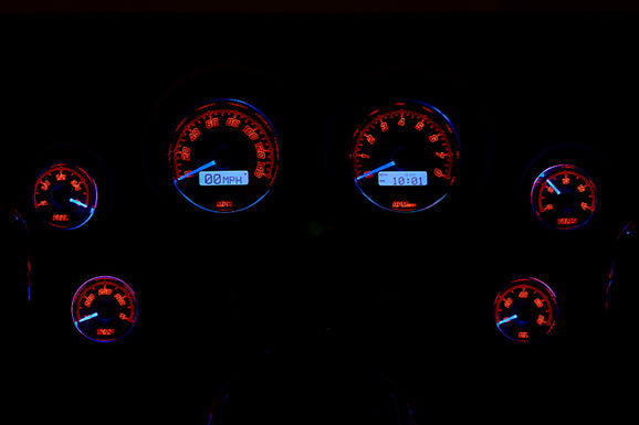 Dakota Digital is proud to introduce the MVX Series Analog Bagger Gauges! With 2 bezel options, 4 background choices and 7 lighting colors to choose from, the combinations are nearly endless. Personalize your setup by programming the Pointer, Backlight, and LCD Message Center colors independently. Whether you start with a 2-gauge set and build your favorite options or choose the 6 gauge pre-configured setup, you can display 7-gauge readings in the LCD Message Centers in the Speedometer and Tachometer (Speed, RPM, Volts, Fuel, Oil Pressure, Oil Temp, and Air Temp), as well as Miles to Empty and performance readouts(0-60 speed and time as well as  ¼ mile speed and time).