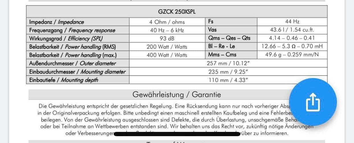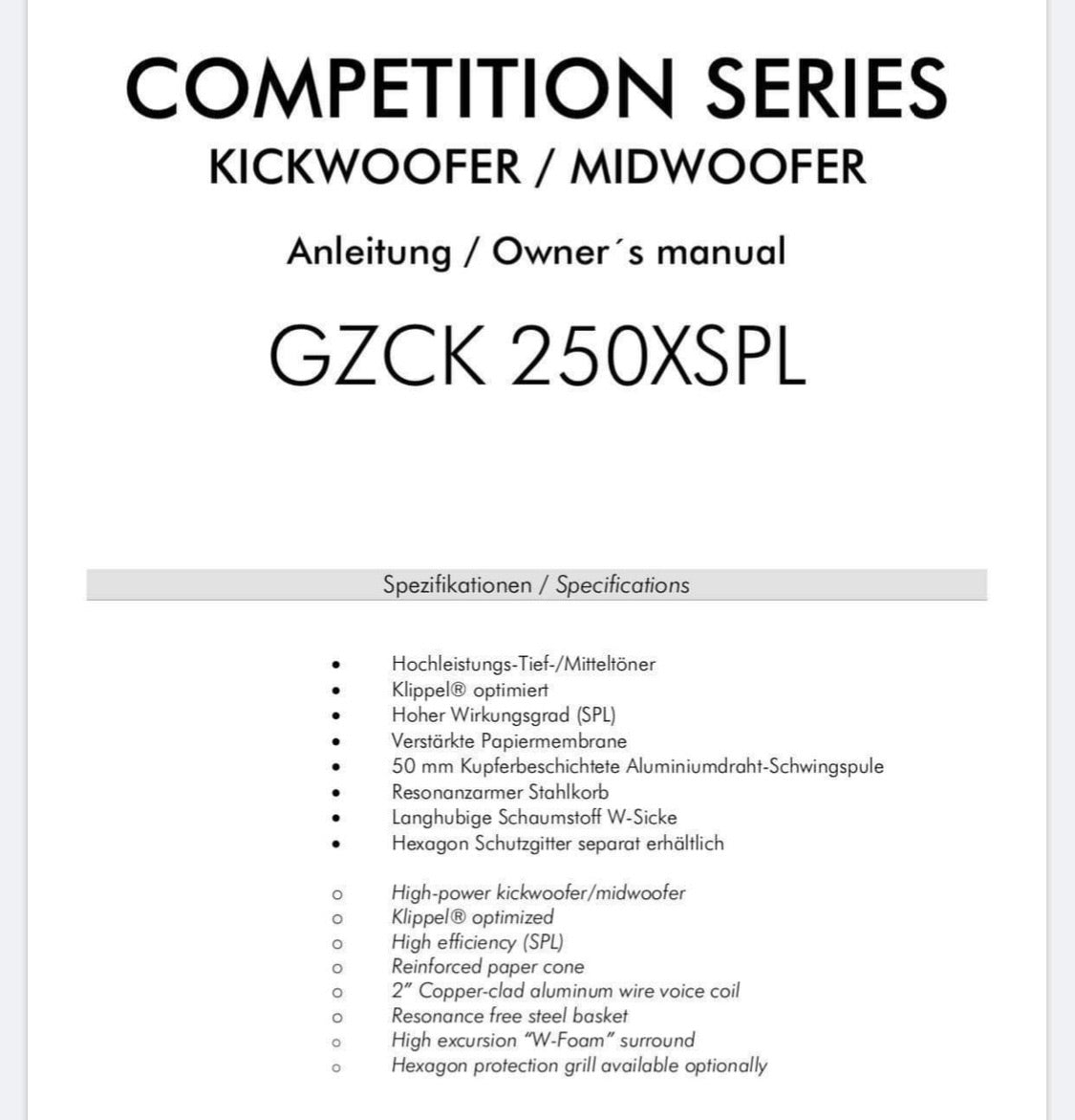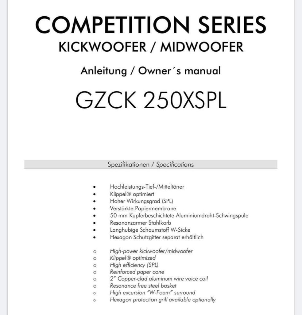 250 mm / 10″ high efficient SPL midwoofer with stiff reinforced paper cone and long stroke CCAW voice coil, incl. grill