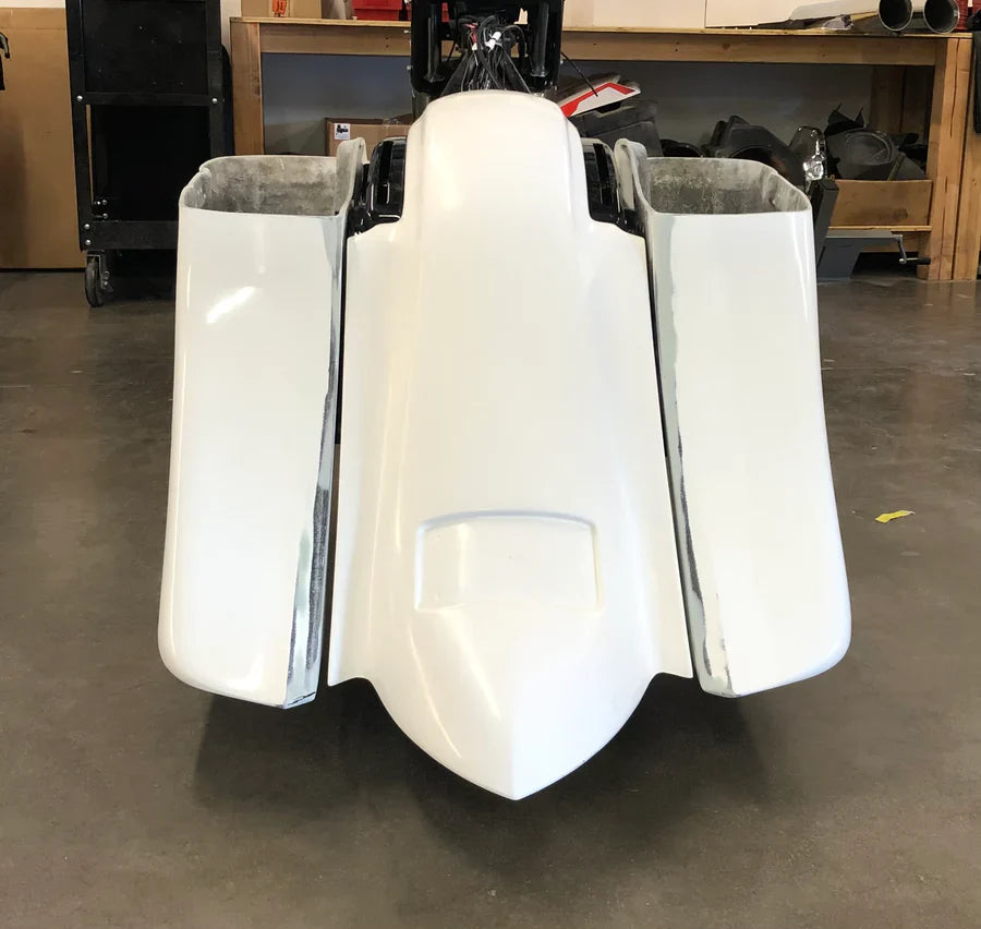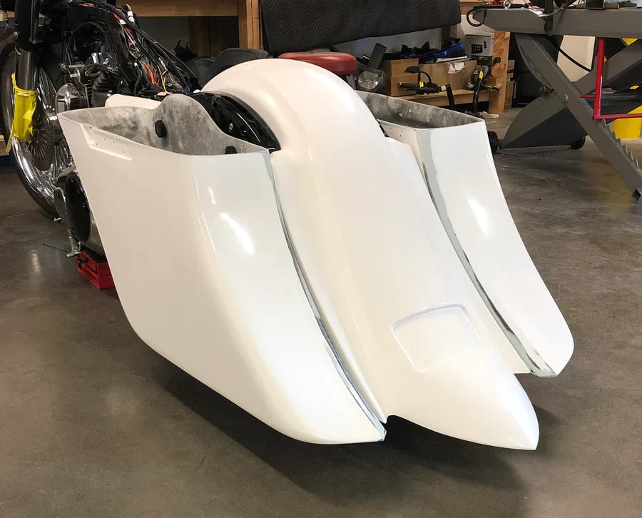 Insane Asylum Motorsports 6” down and 8” back bags completely smooth and industry first curved front edge will make your Bad Ass Bagger look like it is always moving. With our curved side covers and tank kit your bike will flow from front to back. With our fit and finish your bagger will look great from all angles.