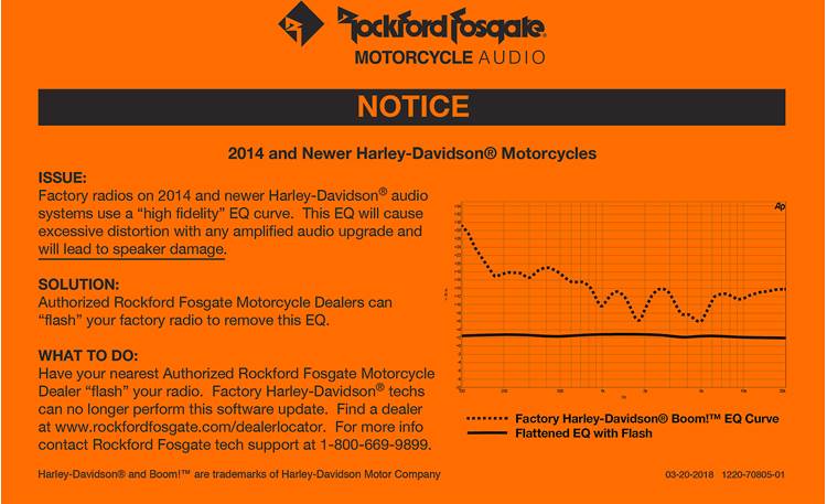 Note: All 2014-up Harley Davidson radios use a “high fidelity” EQ curve which will cause severe distortion in any audio upgrade. You can get this EQ curve removed at your dealership.