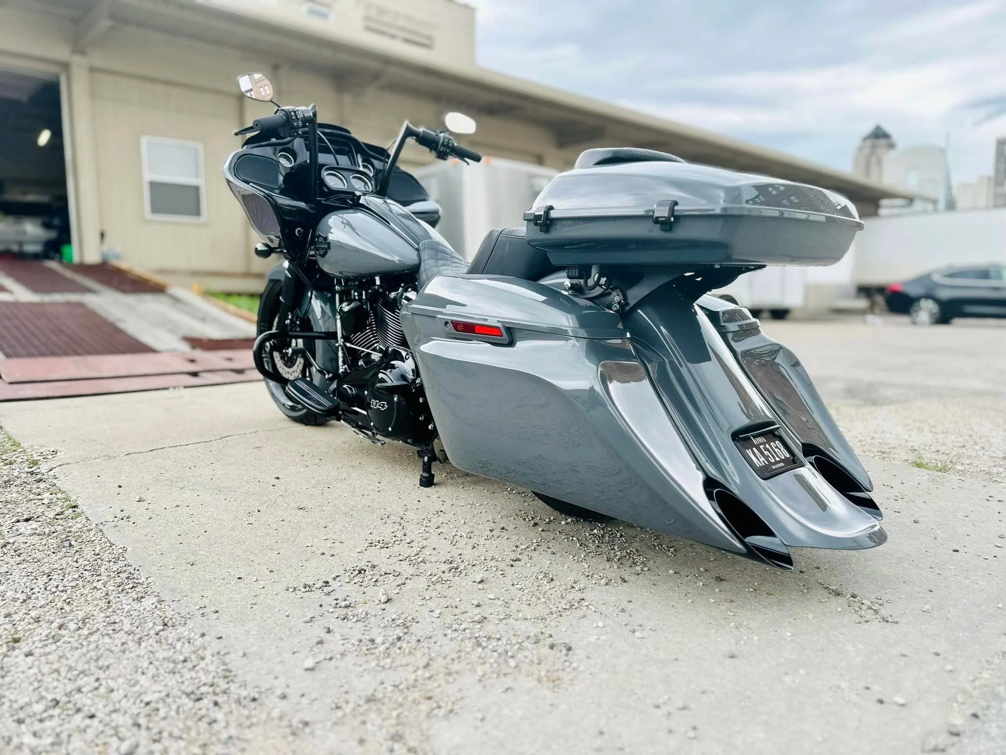 The bags have a 10" ring and now will come with molded side cover part of the bag. Requires stock rail system and can still use the 14+ OEM built lids. You can order this set up with Dual Exhaust cutouts. These bags are 5” down and 9” out, off of OEM bags.